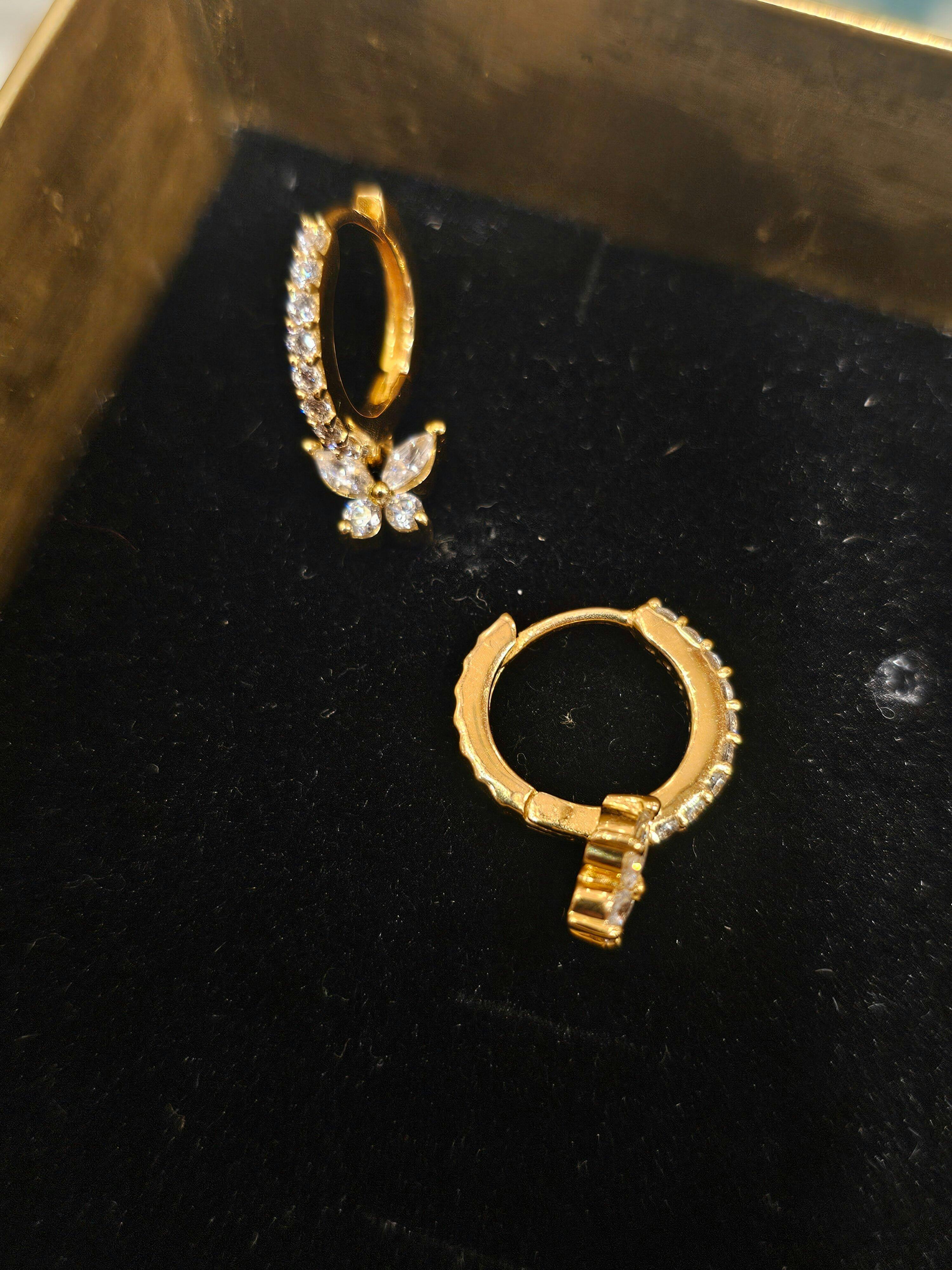 These elegant gold hoop earrings feature dazzling butterfly charms adorned with clear, marquise-cut stones that capture the